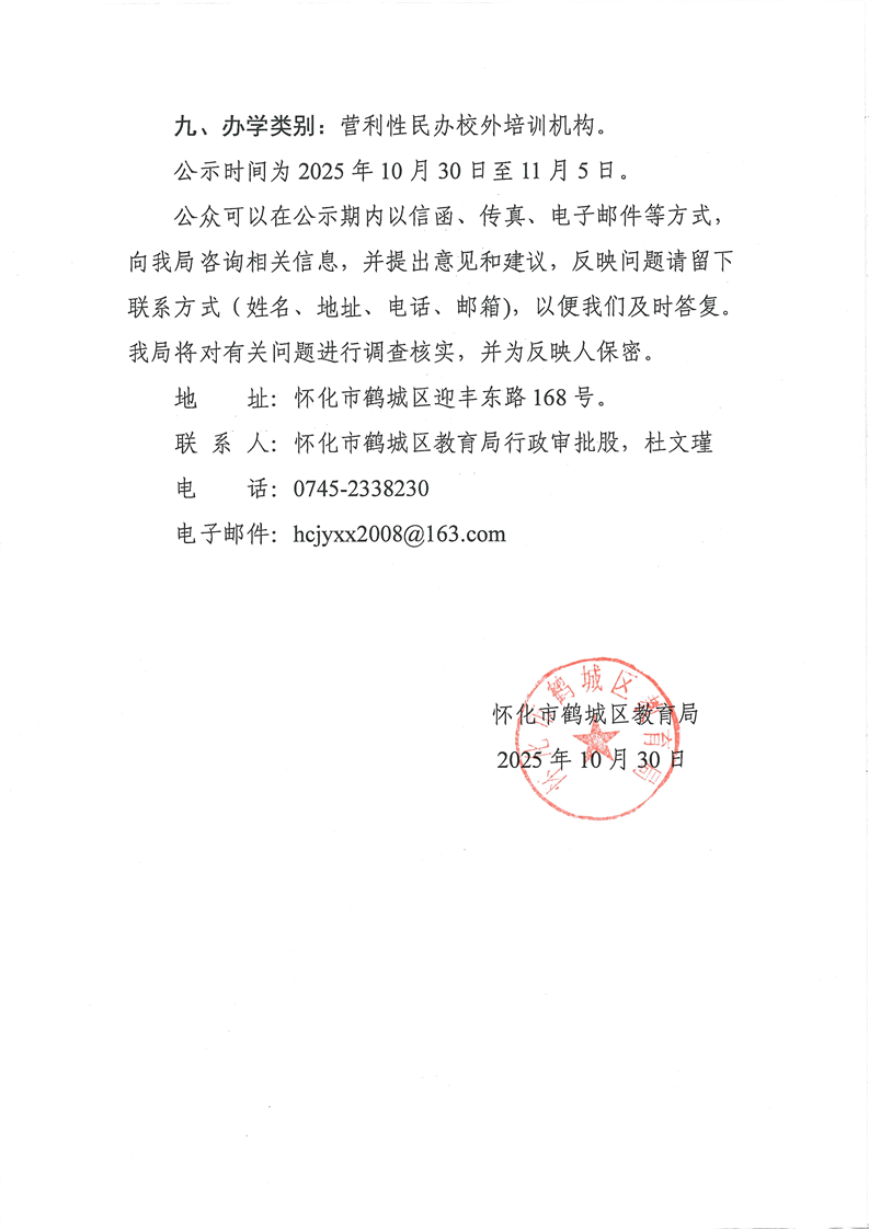 关于拟同意怀化市鹤城区爱嘉教育培训学校终止办学的公示