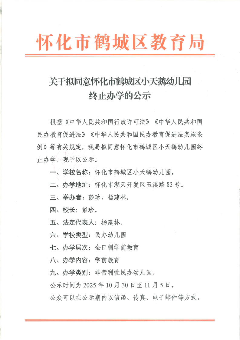 关于拟同意怀化市鹤城区小天鹅幼儿园终止办学的公示