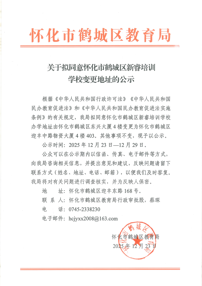 关于拟同意怀化市鹤城区新睿培训学校变更地址的公示