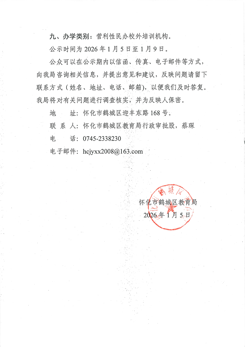 关于拟同意怀化市鹤城区云轩艺术培训学校终止办学的公示