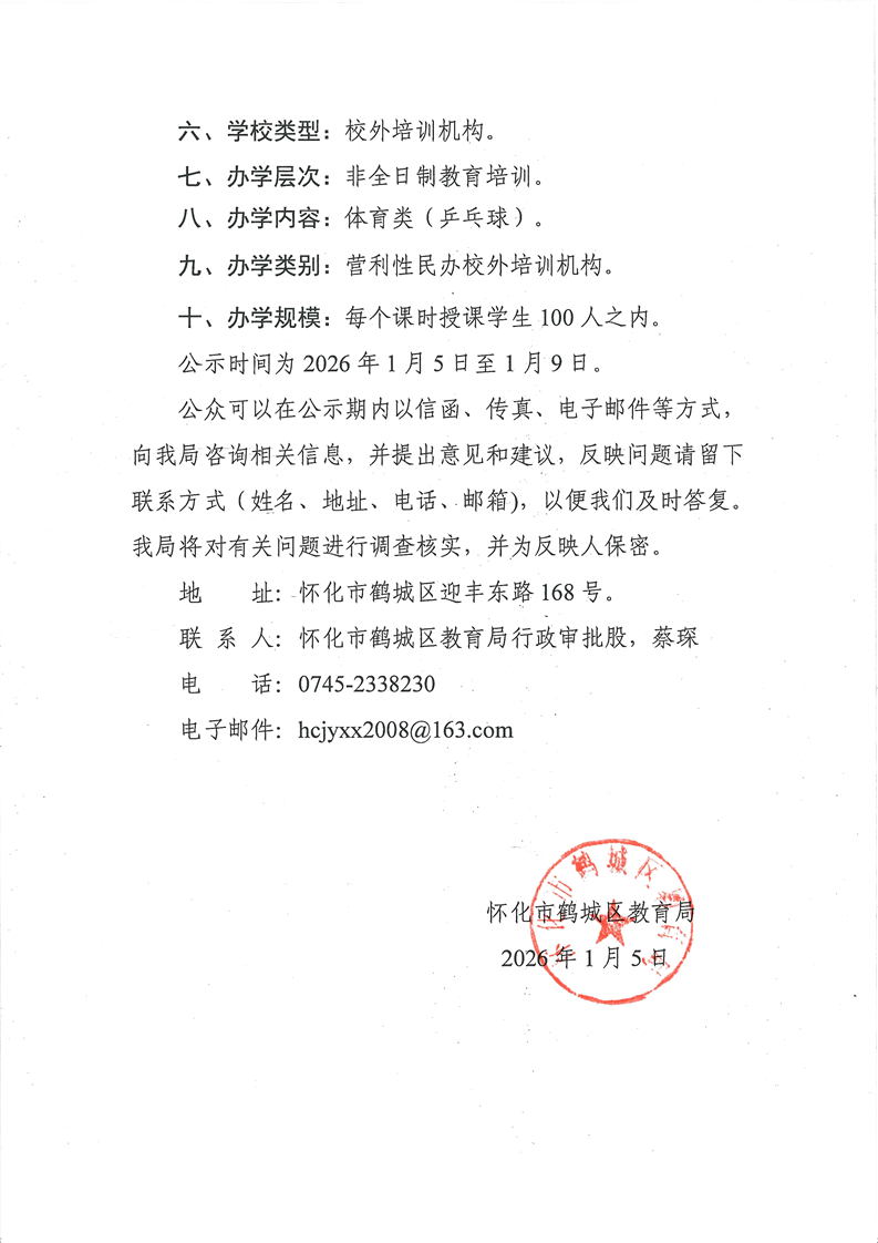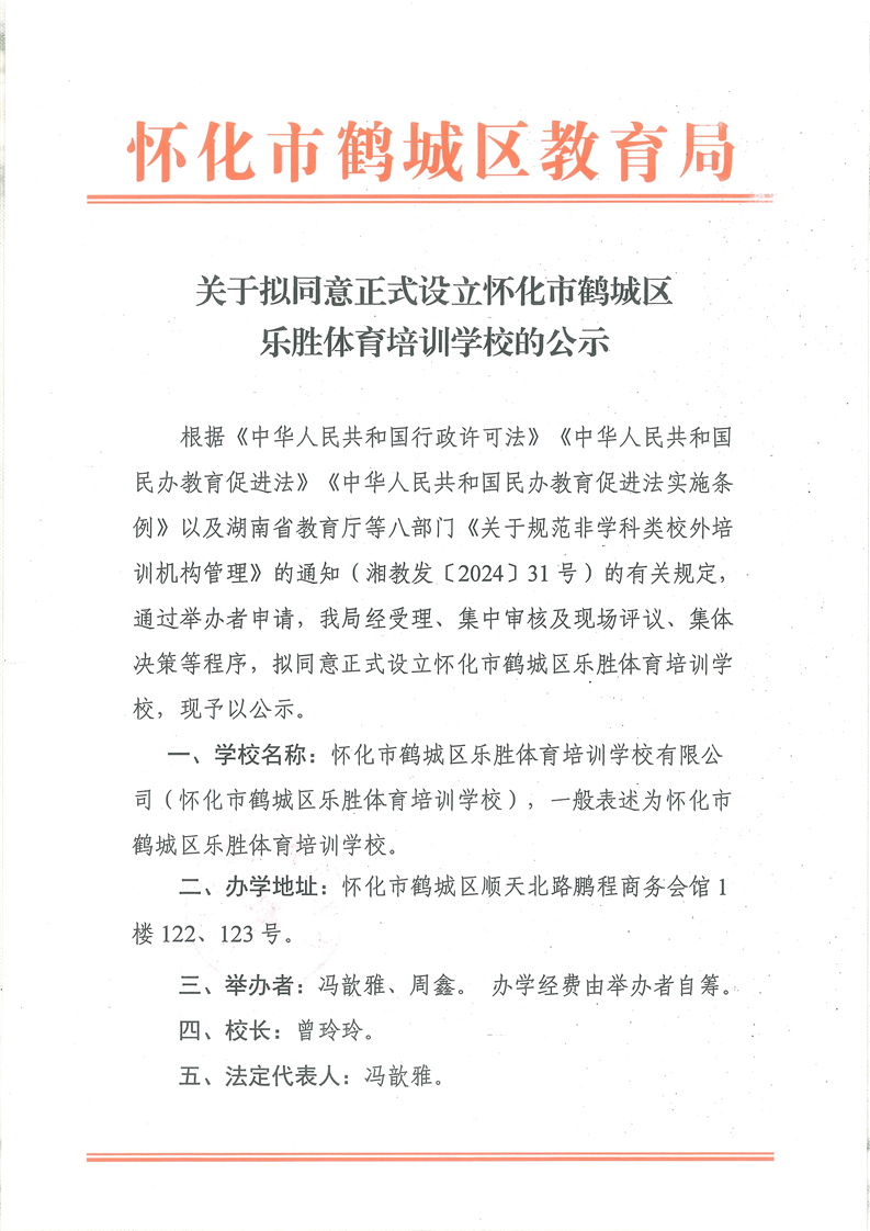 关于拟同意正式设立怀化市鹤城区乐胜体育培训学校的公示