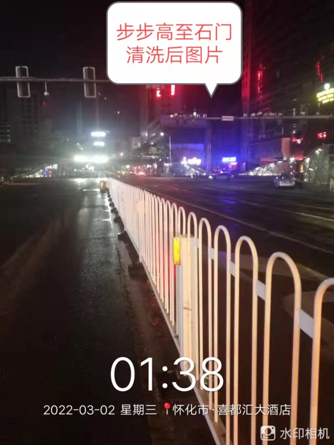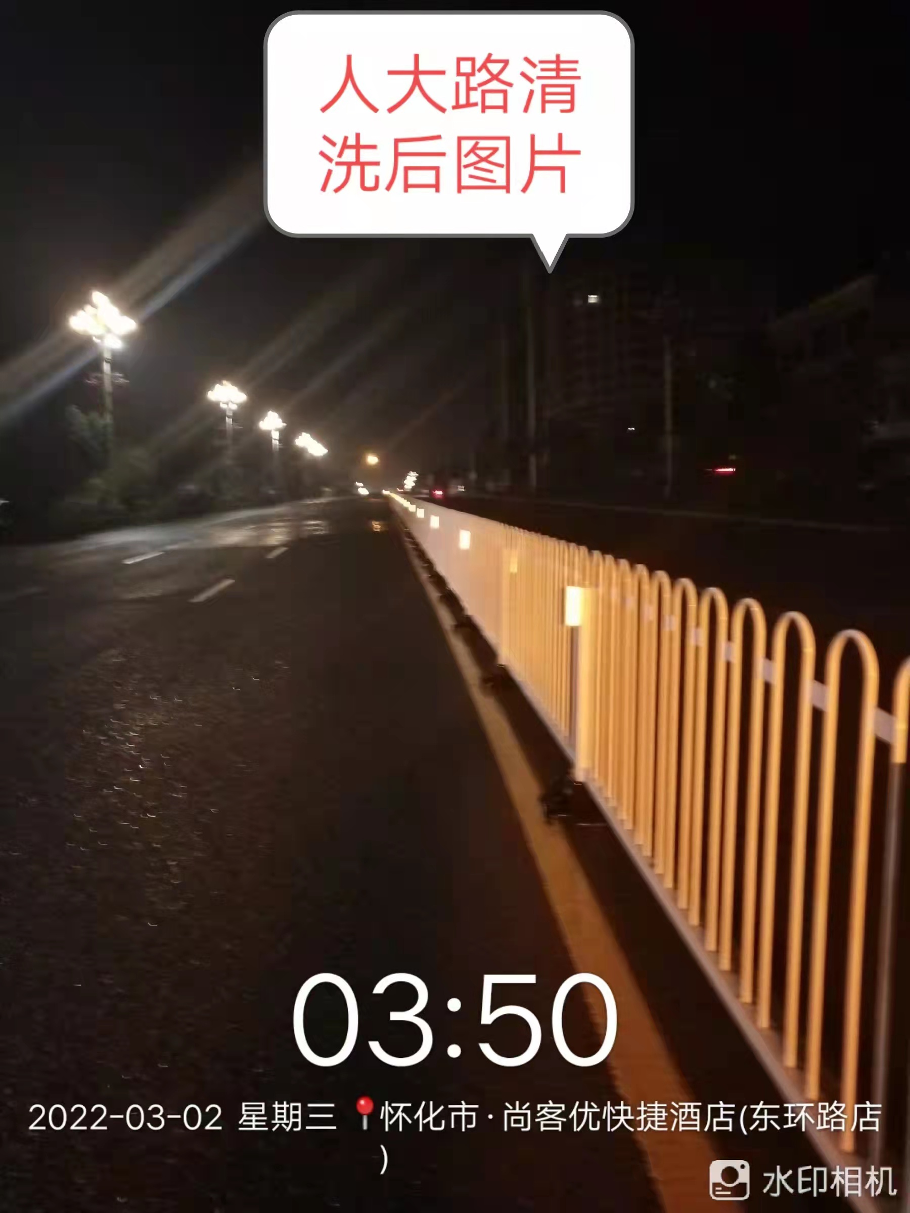 3月2日凌晨1点开始,鹤城区环卫服务中心城中机械化大队管理的一台护栏清洗专用车已早早展开对迎丰路全线护栏的清洗工作。当时间来到3点50分时,该台专车已行驶至宏宇新城附近的人大路(东环路),道路中间的护栏已被清洗地面貌一新。
