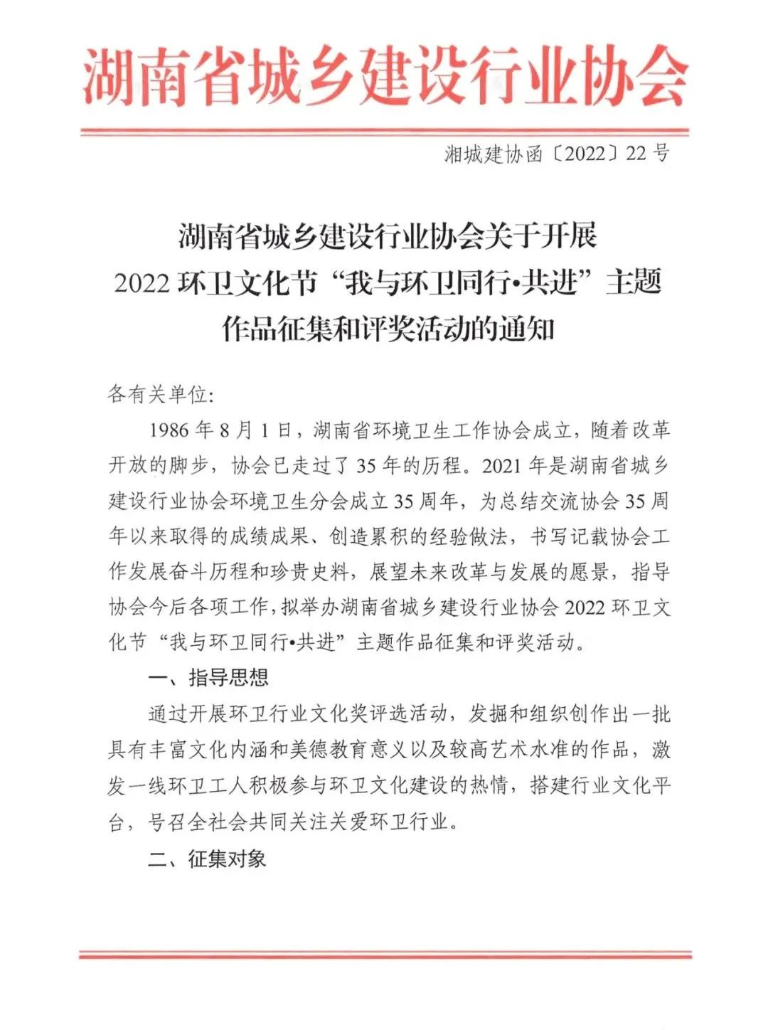 关于开展2022环卫文化节“我与环卫同行·共进”主题作品征集和评奖活动的通知