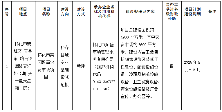 根据省商务厅、省财政厅、省农业农村厅《关于2025—2026年县域商业建设行动项目库建立和管理的通知》(湘商建〔2025〕2号)要求,鹤城区商务局公开征集项目,经企业自愿申报,区商务局、财政局、农业农村局等部门联合对申报项目进行核查与遴选,拟推荐怀化市顺盛市场管理服务有限公司“怀化市菜园智慧农贸市场项目”申报2025-2026年县域商业建设行动项目。现将项目有关情况进行公示如下,公示期限2025年10月15日-2025年10月19日,公示期间,任何单位或个人对项目的真实性、合法性、重复性有异议,可通过以下方式向鹤城区商务局反映,反映情况需实名并提供有效证明材料,逾期不予受理。