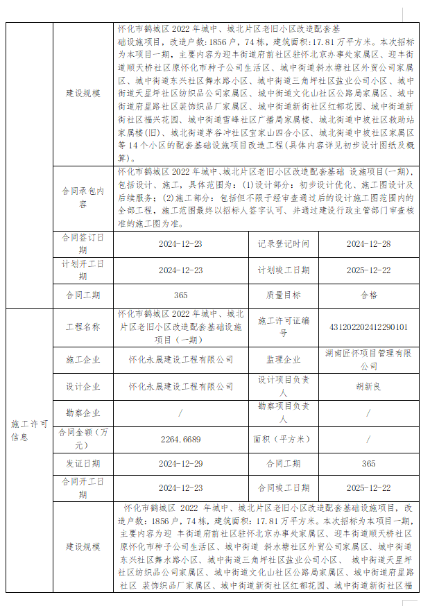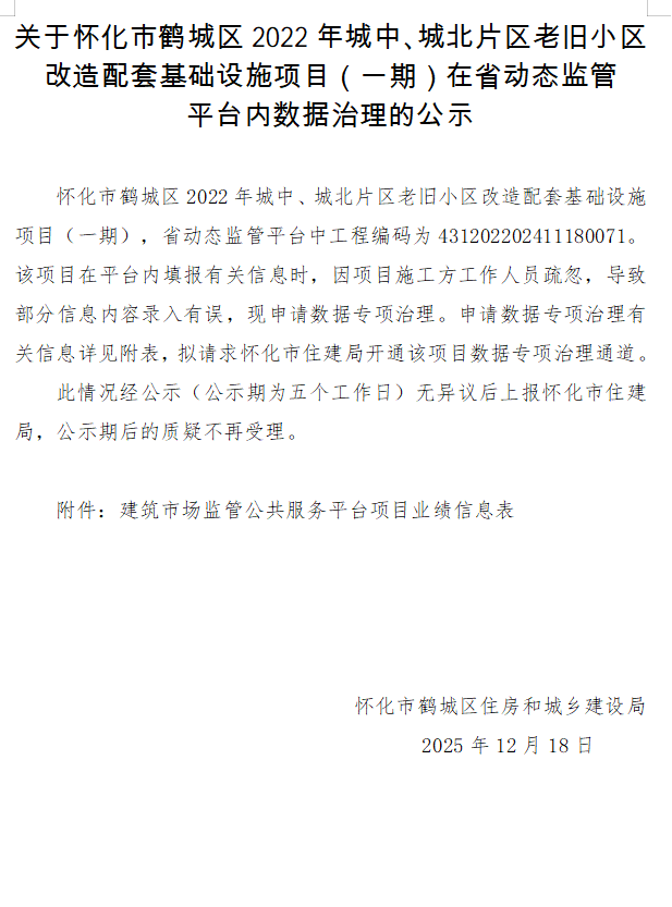 关于怀化市鹤城区2022年城中、城北片区老旧小区改造配套基础设施项目(一期)在省动态监管平台内数据治理的公示