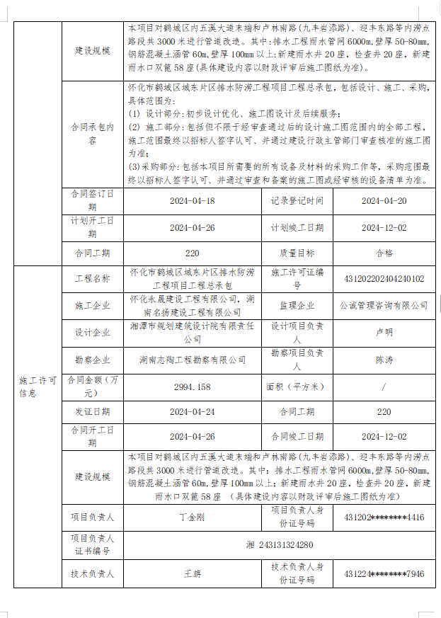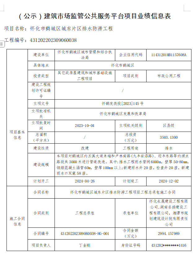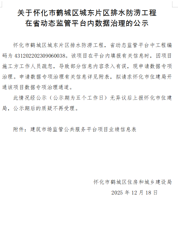 关于怀化市鹤城区城东片区排水防涝工程在省动态监管平台内数据治理的公示