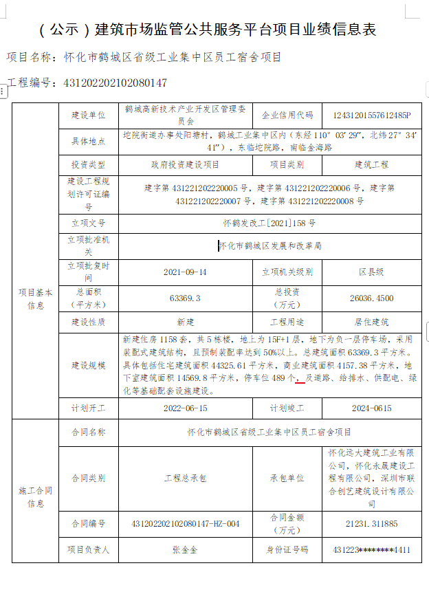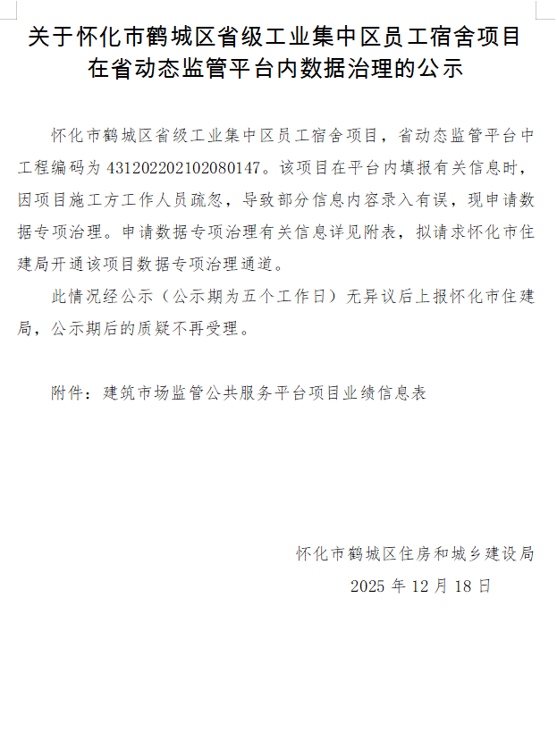 关于怀化市鹤城区省级工业集中区员工宿舍项目在省动态监管平台内数据治理的公示
