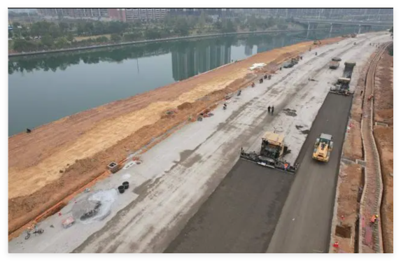 图 1 鹤中一体化沿河路项目正在铺设水稳层