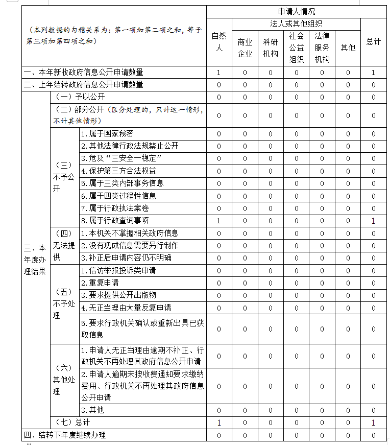 (二)依申请公开情况。按照相关要求,编写信息公开指南,包括信息公开目录和依申请公开的途径,进一步做好依申请公开工作,保障公众依法行使知情权、参与权、表达权、监督权。2024年,共收到政府信息公开申请1件。