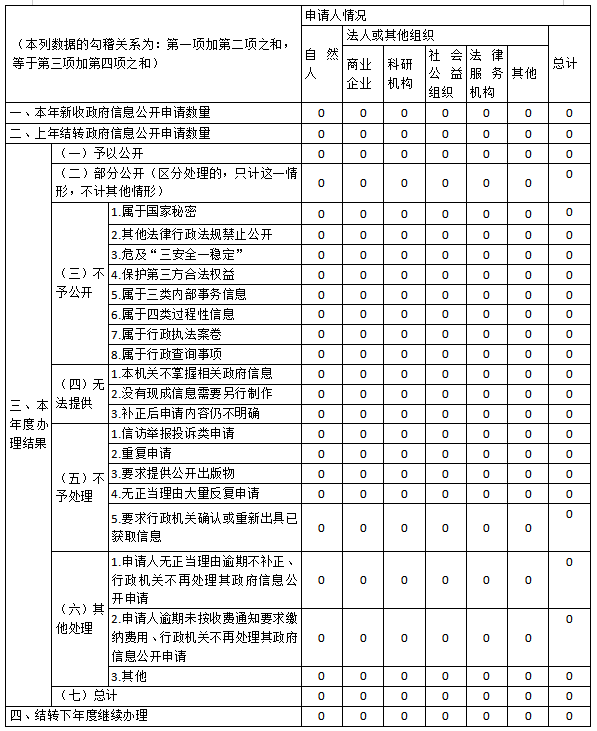 本年度报告根据《中华人民共和国政府信息公开条例》(以下简称《条例》)、湖南省政务公开领导小组办公室《关于贯彻落实(中华人民共和国政府信息公开条例)实施方案》(以下简称《实施方案》)及《怀化市政府信息公开实施细则》(以下简称《细则》)的有关规定,由鹤城区林业局编制。全文由总体情况、主动公开政府信息情况、收到和处理政府信息公开申请情况、政府信息公开行政复议行政诉讼情况、存在的主要问题及改进情况及其他需要报告的事项等六部分组成。本报告的统计数据时限为2025年1月1日至12月31日,通过怀化市鹤城区人民政府门户网站对外公布。如对报告有任何疑问、意见,请与怀化市鹤城区林业局联系(地址:怀化市鹤城区金海路行政综合楼9楼,邮编:418000,电话:0745-2270347,电子邮箱:hhhcqlyj@163.com)。