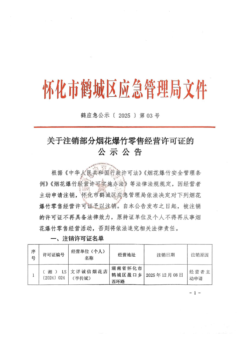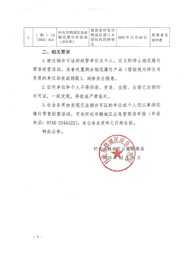 怀化市鹤城区应急管理局关于注销部分烟花爆竹零售经营许可证的公示公告