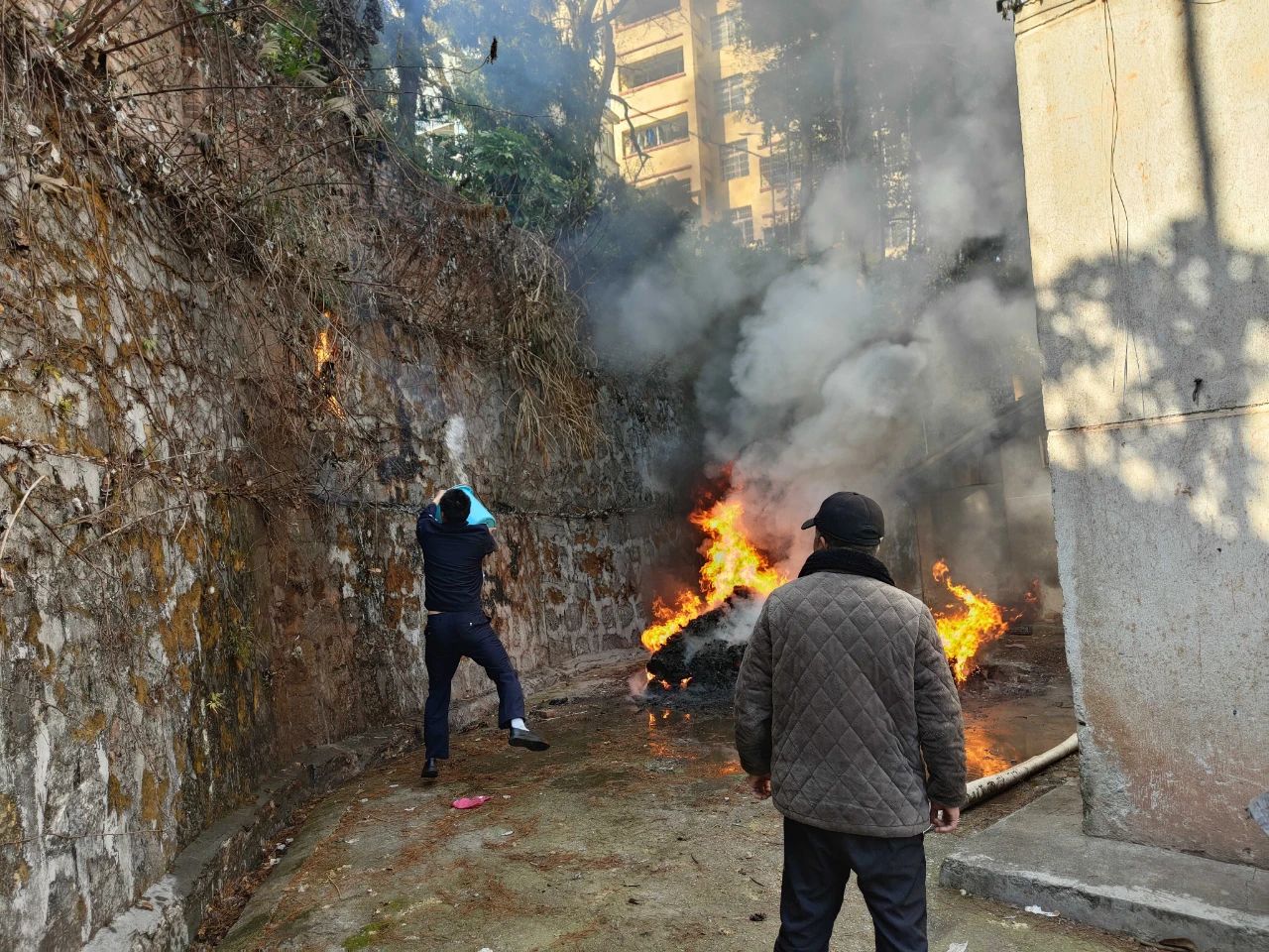 不一会儿,洒水车匆匆驶来,一行人又齐心协力接过水管将熊熊燃烧的大火扑灭。因处置及时,未造成人员伤亡和财产损失,为确保火源彻底熄灭,他们还对火场周围环境进行了全方位检查,清除了所有易燃可燃物,在确保火源彻底熄灭后才放心离开。