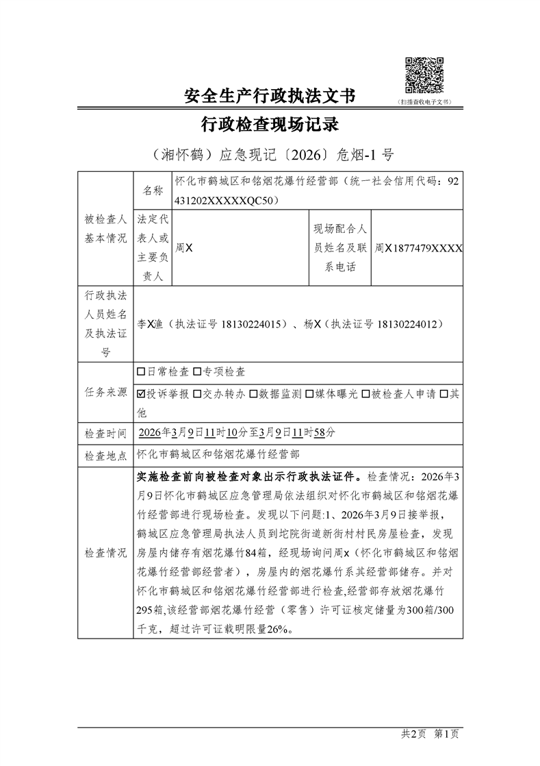 怀化市鹤城区和铭烟花爆竹经营部违法行为公示