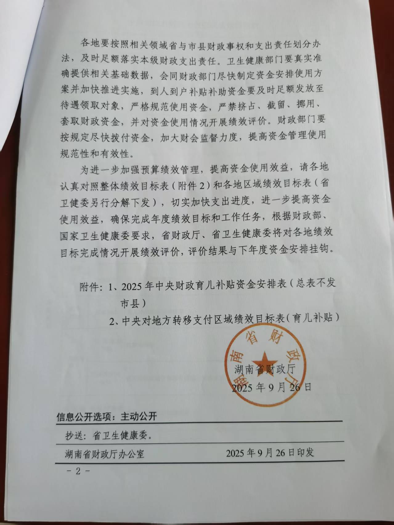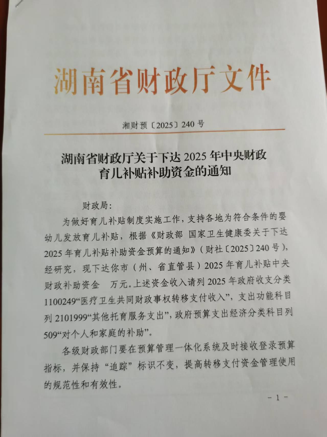 湖南省财政厅关于下达2025年中央财政育儿补贴补助资金的通知
