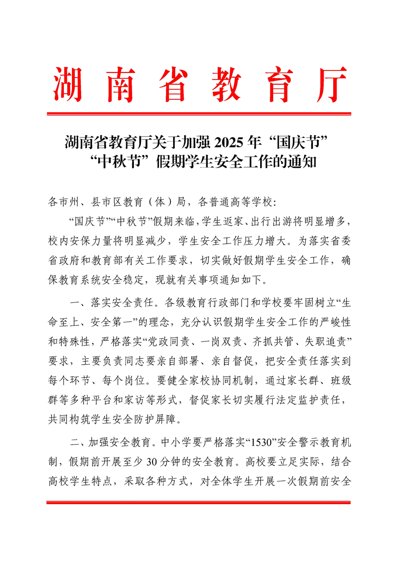 湖南省教育厅关于加强2025年“国庆节”“中秋节”假期学生安全工作的通知