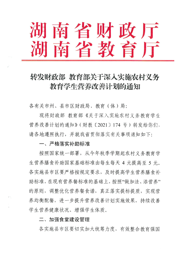 省转发财政部 教育部关于深入实施农村义务教育学生营养改善计划的通知