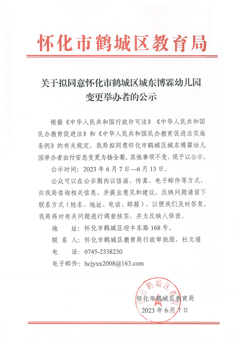 关于拟同意怀化市鹤城区城东博霖幼儿园变更举办者的公示
