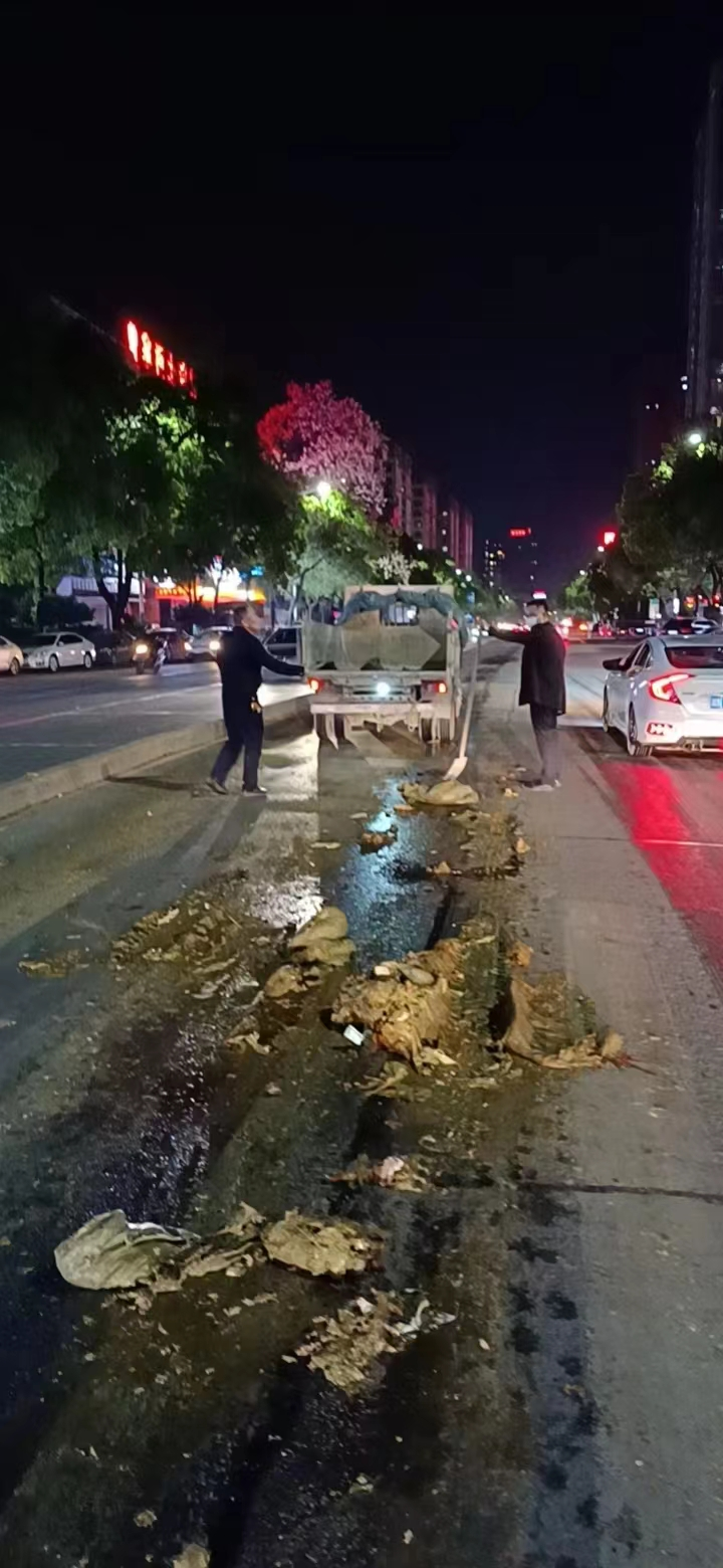 4月10日晚20点,鹤城区环卫服务中心湖天环卫所晚上巡查路面卫生时,发现红星南路农超市场外行车道上散落有大量袋装粪便,污染路面达20余米,现场臭气冲天,车辆行人纷纷避让,造成道路交通拥堵。面对这一突发路面污染事件,区环卫服务中心立即启动应急处置预案,采取应急处置措施,首先安排环卫所迅速设置路障提示过往车辆和行人,然后调动城中机械化大队1台洒水车、1台机扫车迅速赶赴现场,同时联系鹤城区渣土事务中心给予协助。