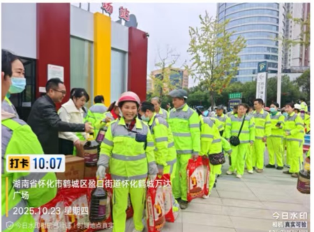 2025年10月23日上午,鹤城区工会在盈口街道万达广场开展慰问活动,为鹤城一线环卫工人送秋日祝福与慰问品,并向奋战在环卫工作岗位上的全体工作者表达了崇高的敬意和亲切的问候。