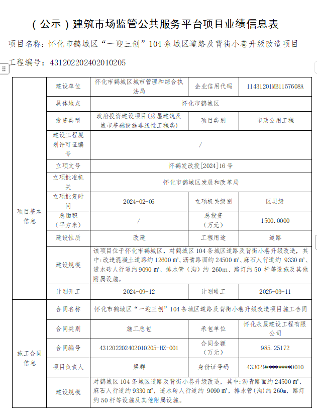 关于怀化市鹤城区“一迎三创”104条城区道路及背街小巷升级改造项目在省动态监管平台内数据治理的公示