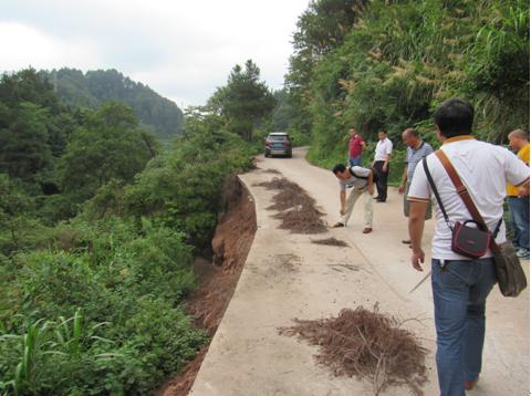 接凉亭坳乡尹家岭村竹林坪组等村民反映,竹林坪水库防汛公路因前段时间的强降雨影响,路基被山水冲垮、路面多处悬空,对村民的农业生产、生活出行等造成了安全隐患。8月10日上午,鹤城区水利局局长陈永国等局班子成员及相关技术人员前往竹林坪水库防汛公路安全隐患点进行查勘。