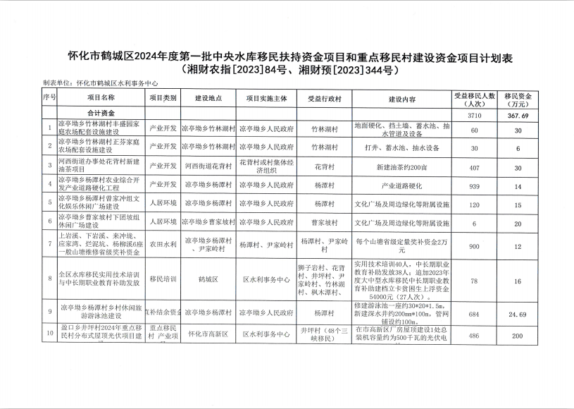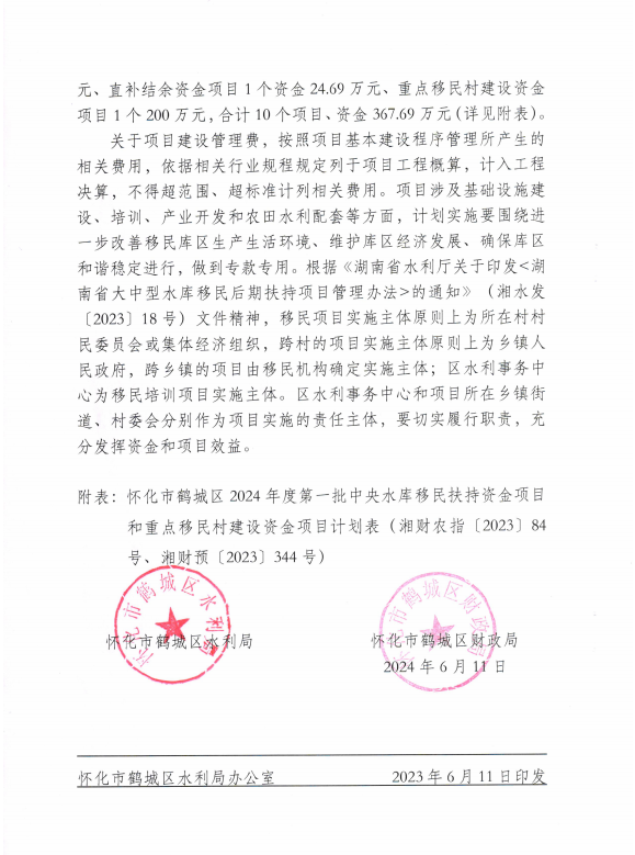 关于下达我区2024年度第一批中央水库移民扶持资金项目计划和重点移民村建设资金项目计划的通知