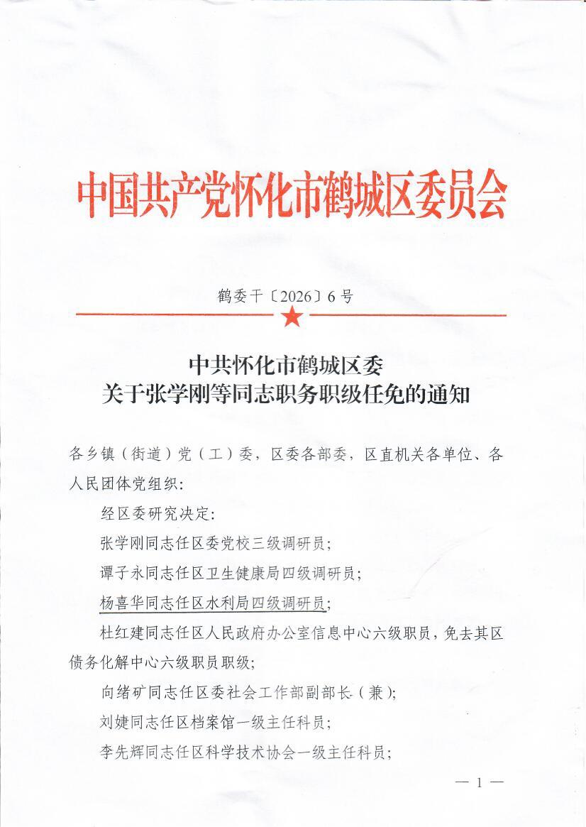 关于张学刚等同志职务职级任免的通知 鹤委干【2026】6号