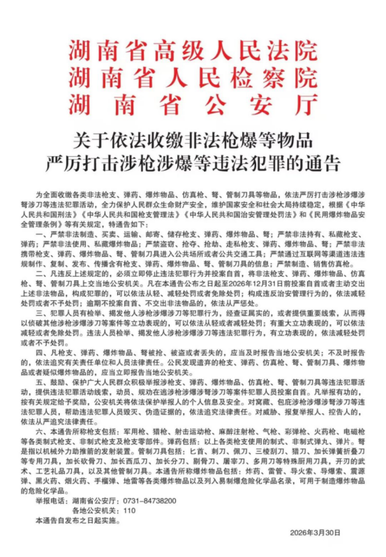 关于依法收缴非法枪爆等物品 严厉打击涉枪涉爆等违法犯罪的通告