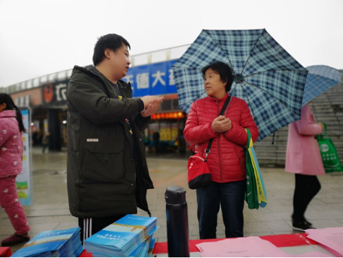 图八、环保工作人员向群众发方宣传资料及解疑释惑(12月4日新天地城市广场)