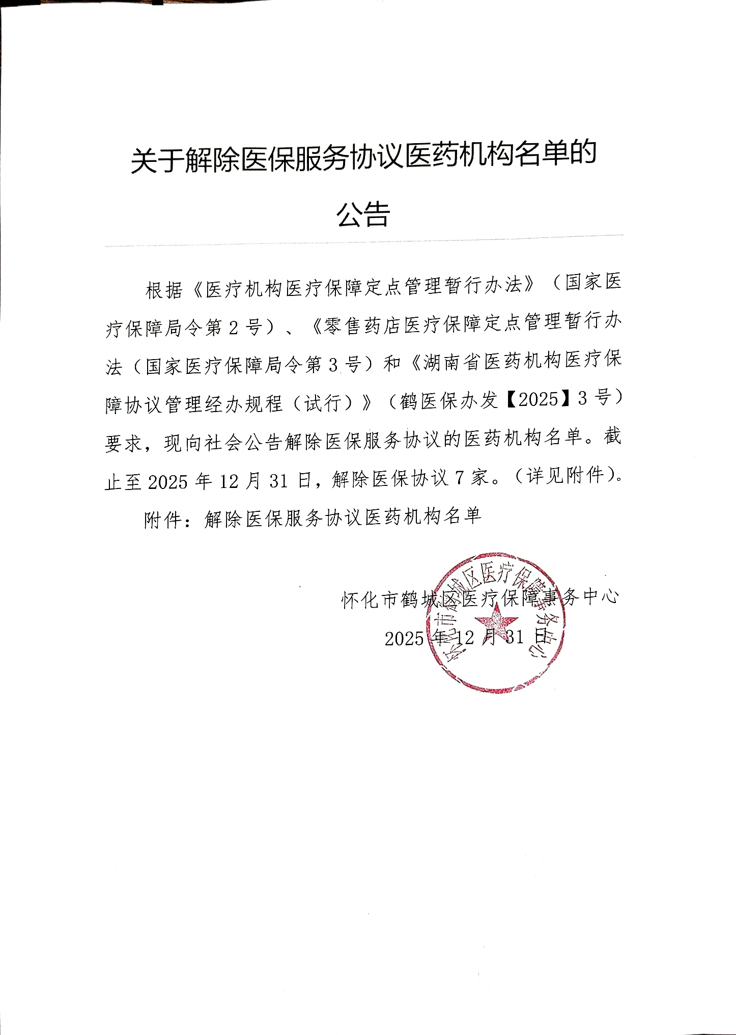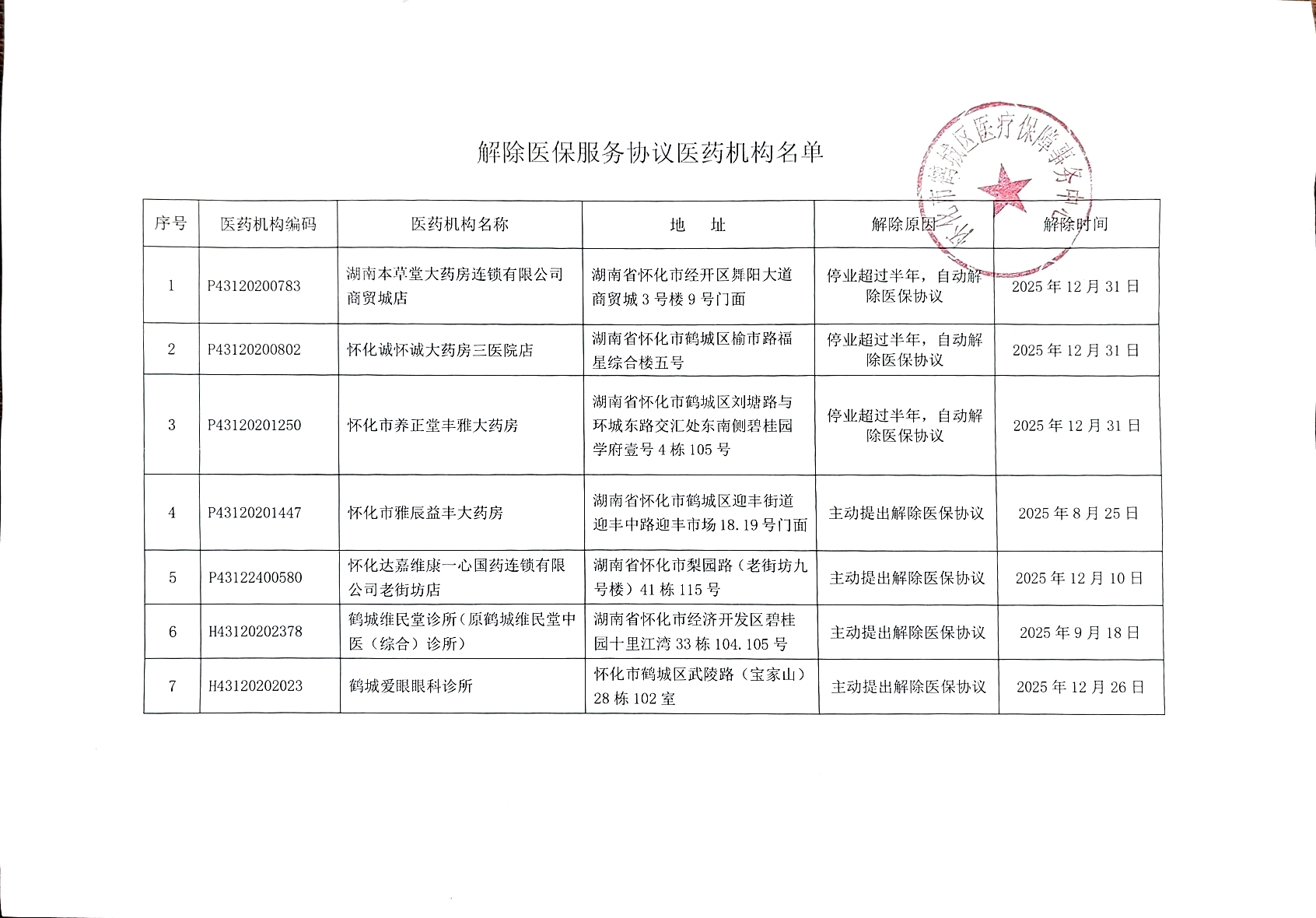 关于解除鹤城爱眼眼科诊所等7家医药机构医保服务协议的公告