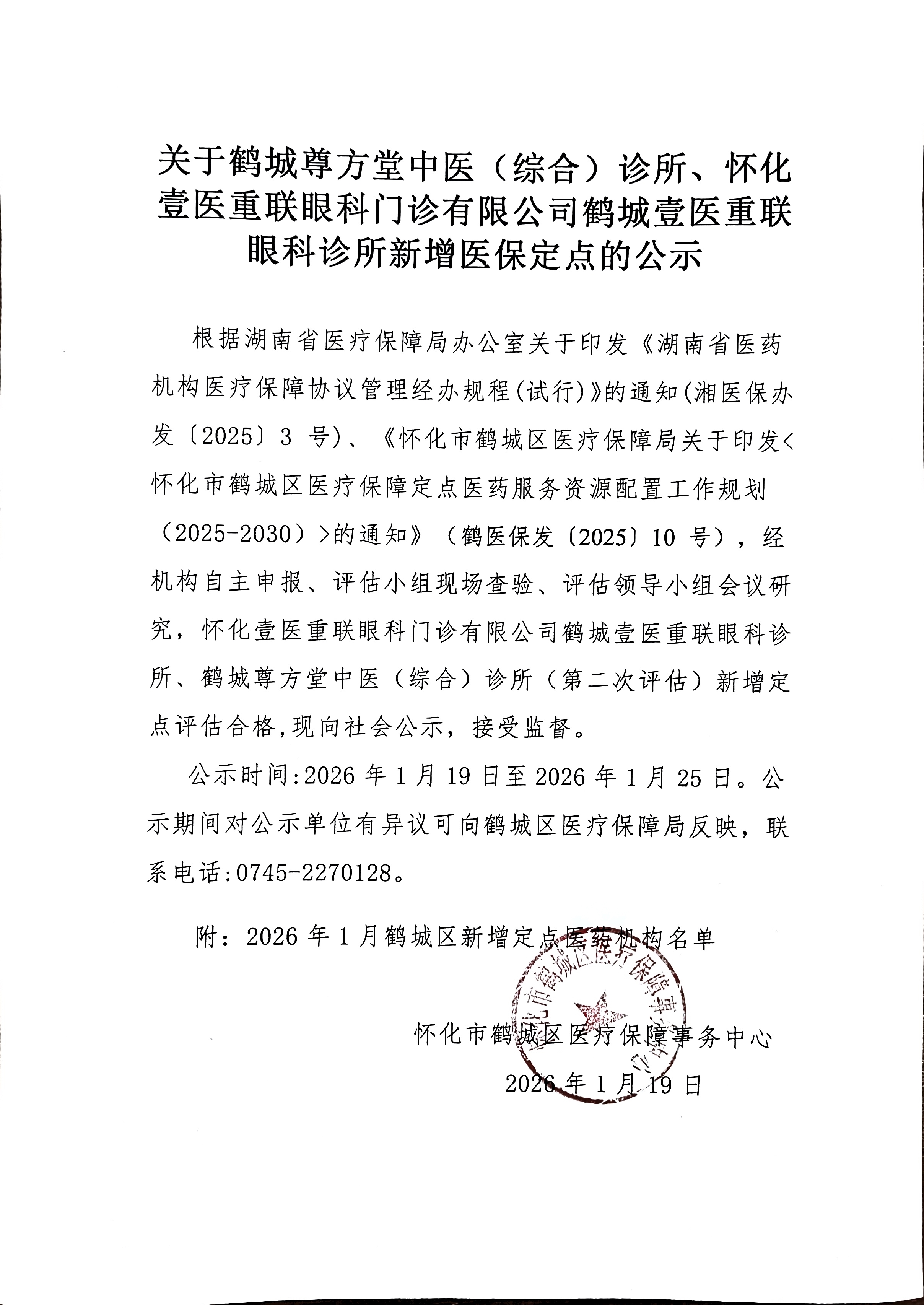 关于鹤城尊方堂中医(综合)诊所、怀化壹医重联眼科门诊有限公司鹤城壹医重联眼科诊所新增医保定点的公示